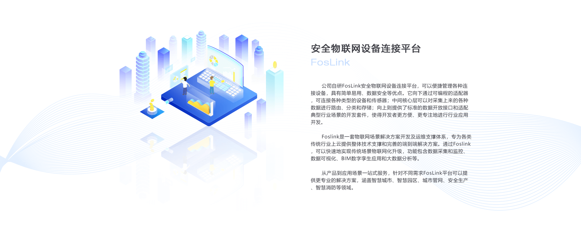 從產(chǎn)品到應用場景一站式服務,針對不同需求FosLink平臺可以提供更專業(yè)的解決方案,涵蓋智慧城市、智慧園區(qū)、城市管網(wǎng)、安全生產(chǎn)、智慧消防等領(lǐng)域。